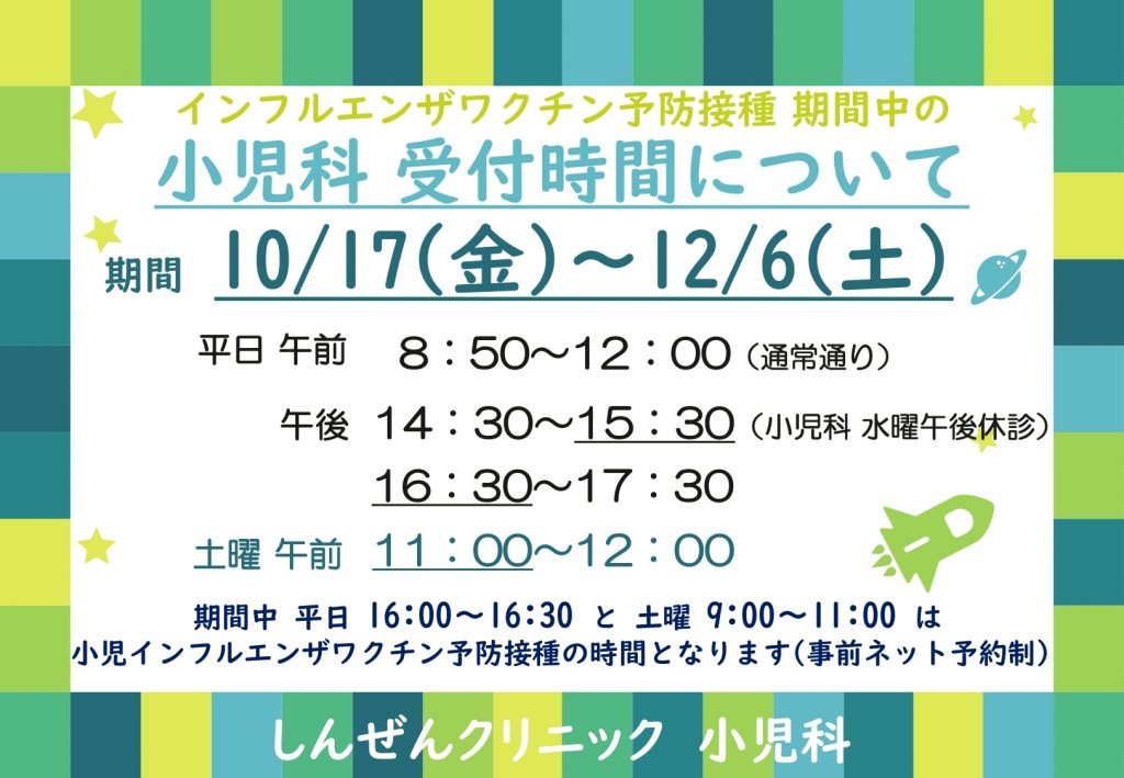 インフルワクチン接種期間 小児科受付変更について(10/17-12/6) 2025/10/10 クリニックからのお知らせ インフルエンザ予防接種 期間の小児科 受付時間について 10/17(金)~12/6(土)の間、小児インフルエンザワクチン予防接種に伴い、小児科診療の受付時間を変更いたします。ワクチン予防接種のお子さんと風邪症状のお子さんの診療時間帯を分けて対応いたします。予防接種の時間終了まで院外でお待ちいただく場合もござますのでご了承ください。(※ 小児科 水曜午後 休診) ご理解ご協力の程よろしくお願いいたします。